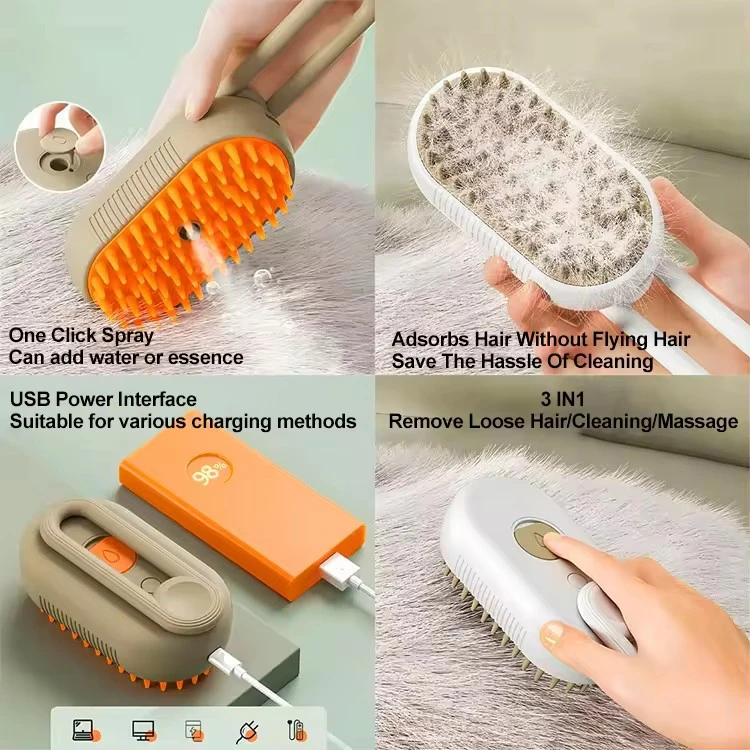 Conjunto de cepillos para pelaje de mascotas, incluye cepillo con púas naranjas, cepillo de cerdas para retirada de pelaje y un accesorio 3 en 1 con carga USB. Diseño ergonómico y fácil limpieza, ideal para cuidado en casa.