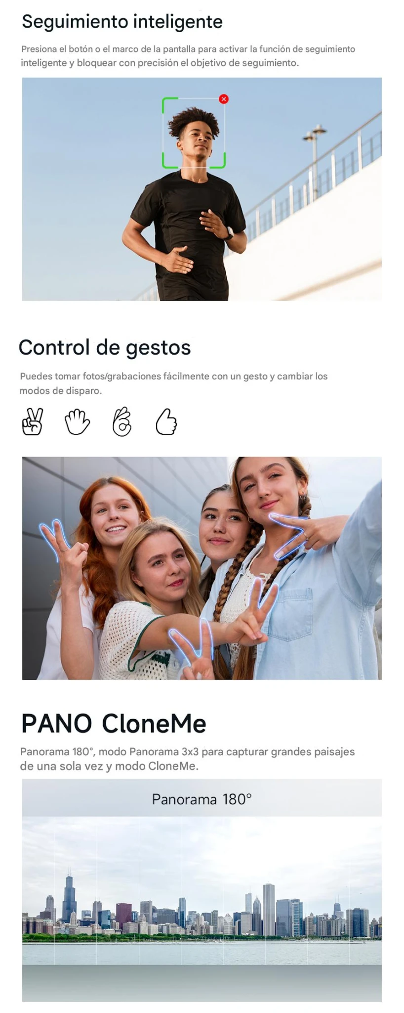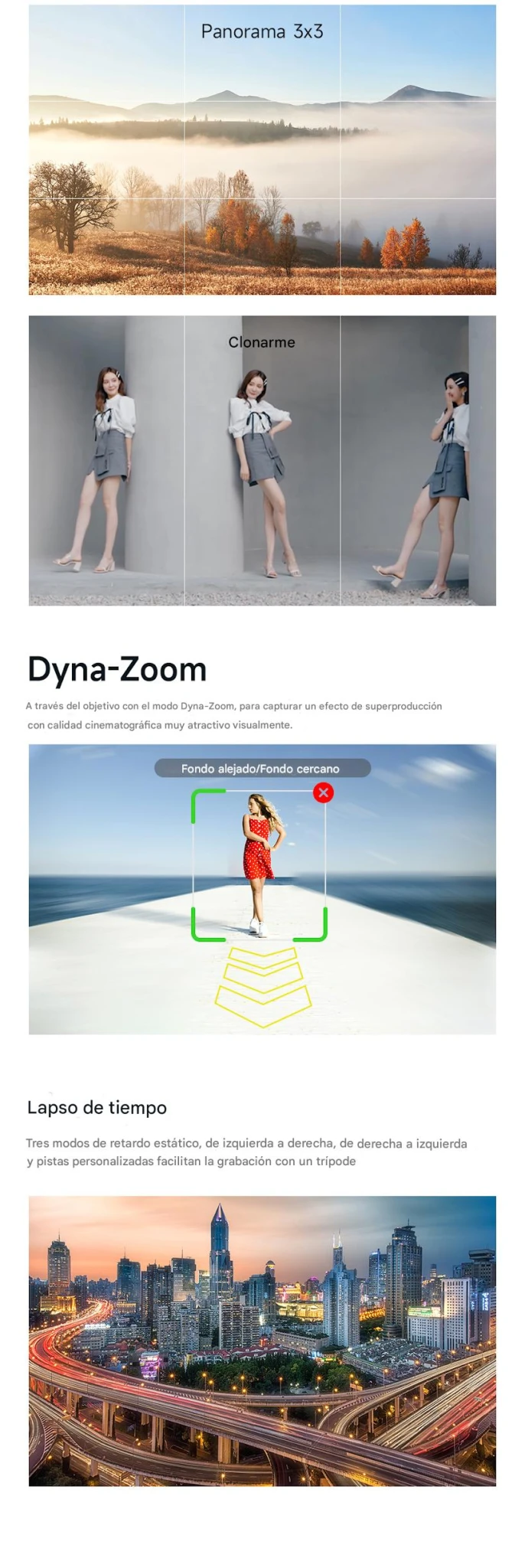 • Crea contenidos de aspecto profesional con funciones de zoom dinámico, timelapse, panoramas y modos de filmación de una sola mano.