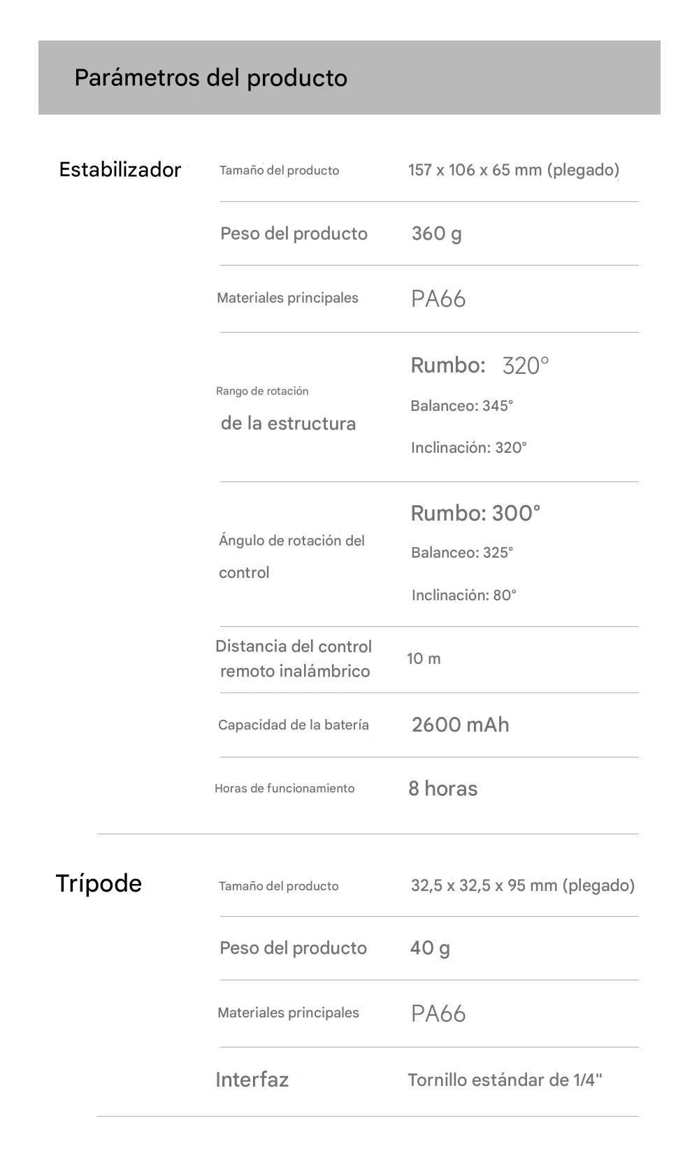 • Estabilizador: tamaño 157 × 106 × 65 mm ( fold ), peso 360 g; materiales PA66