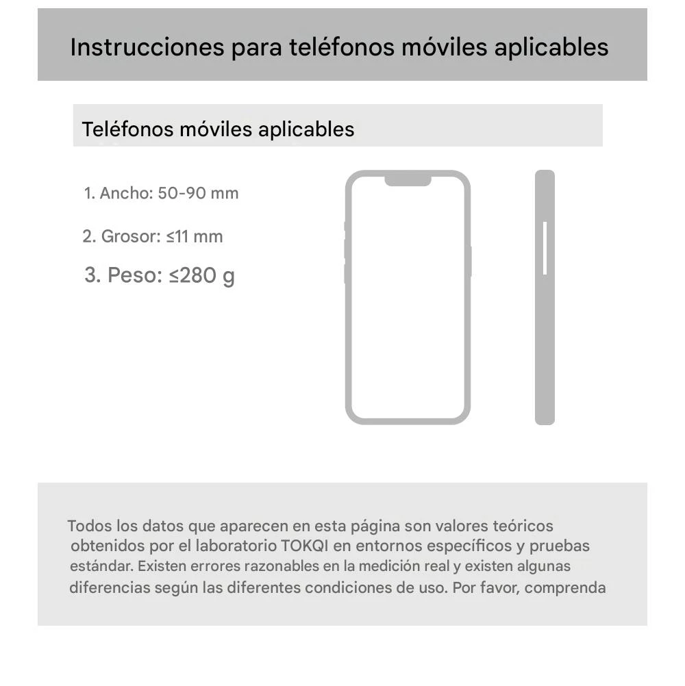• Frente de teléfono: 50–90 mm de ancho, espesor ≤ 11 mm