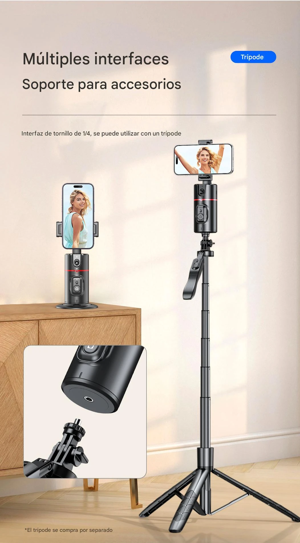 - Interfaz con tornillo 1/4" compatible con trípode: permite montar el soporte en trípodes o accesorios de iluminación, ampliando las opciones de encuadre.