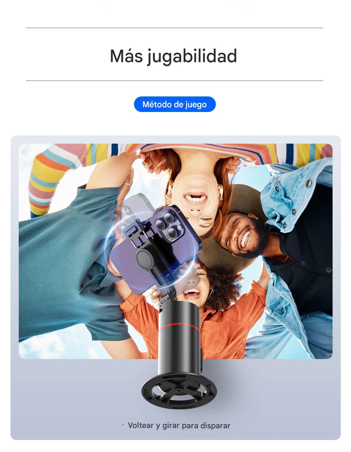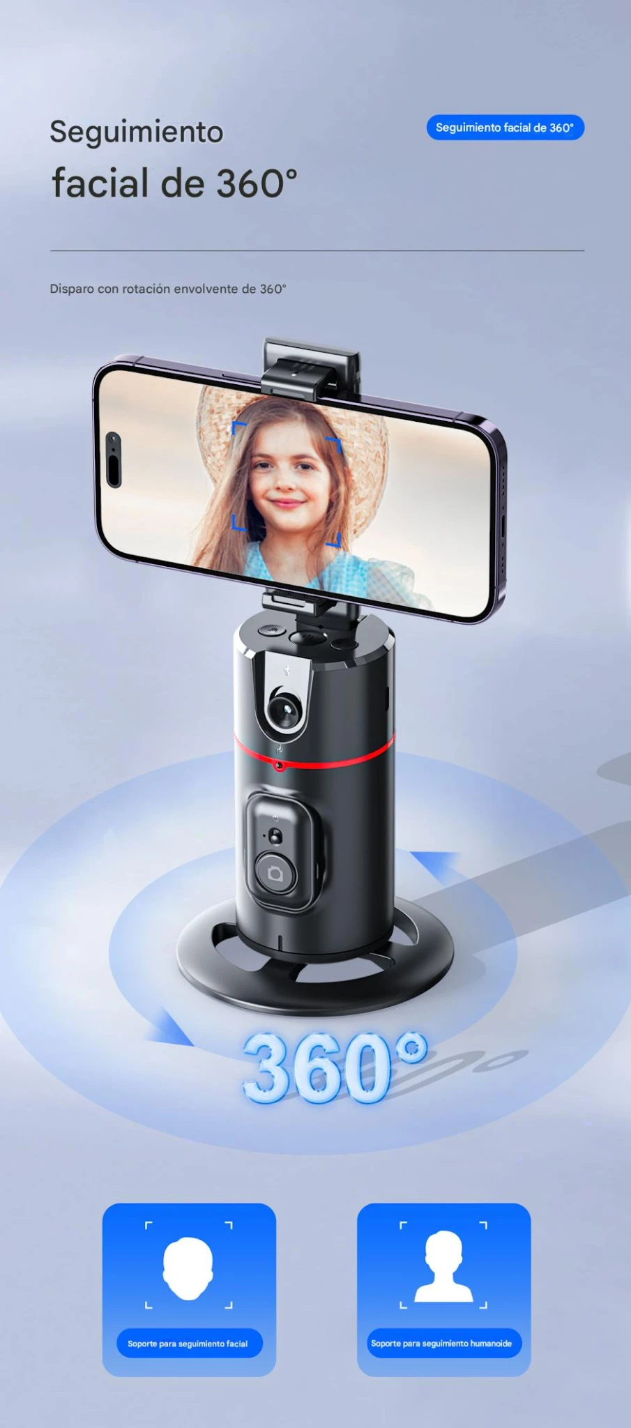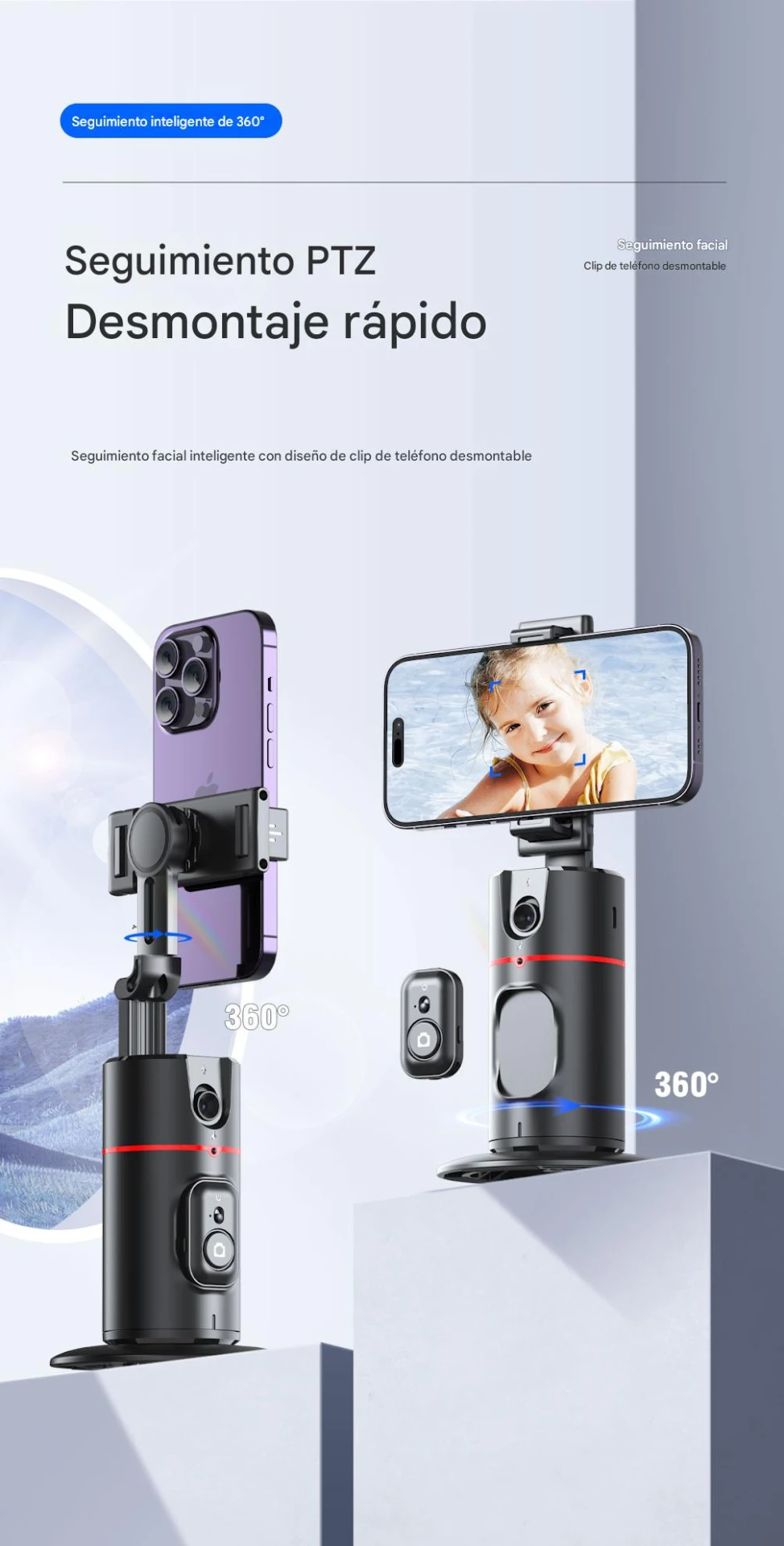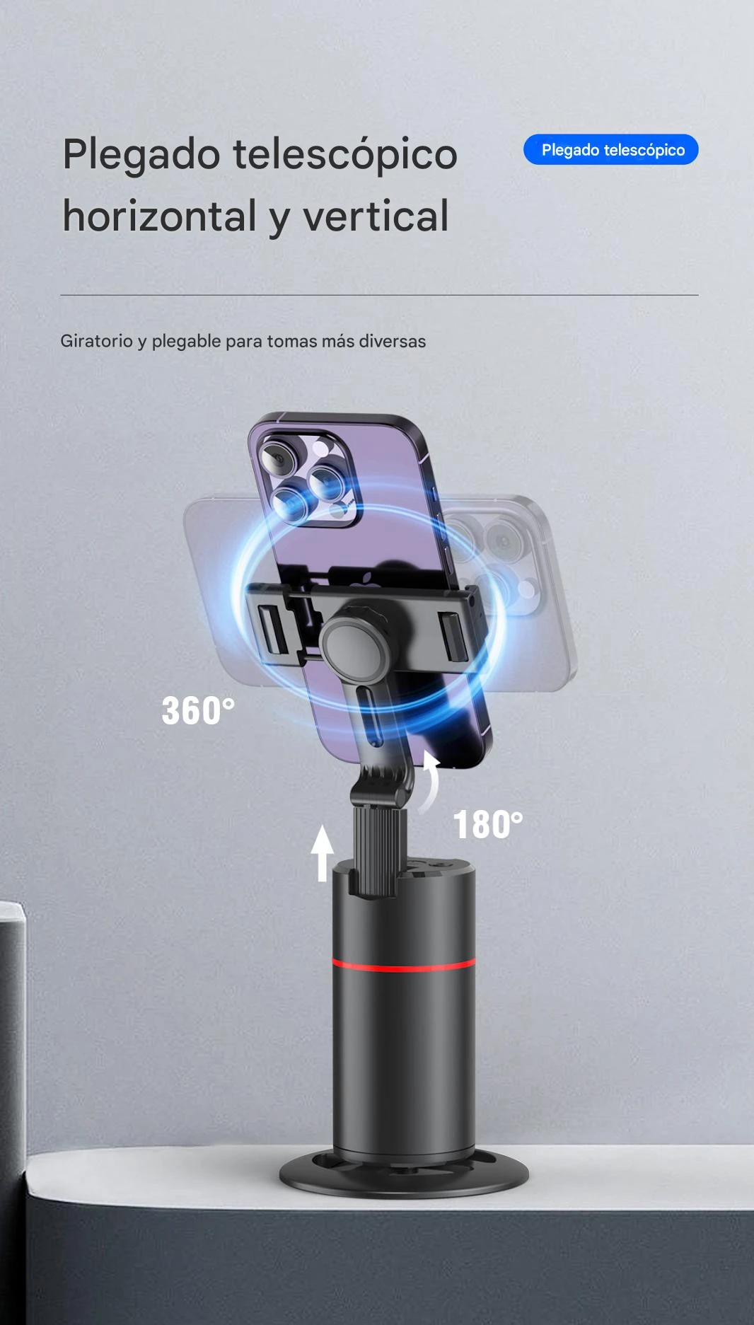 - Rotación 360° y giro de 180°: proporciona libertad total para orientar el teléfono y capturar tomas en diferentes ángulos sin mover el soporte base.