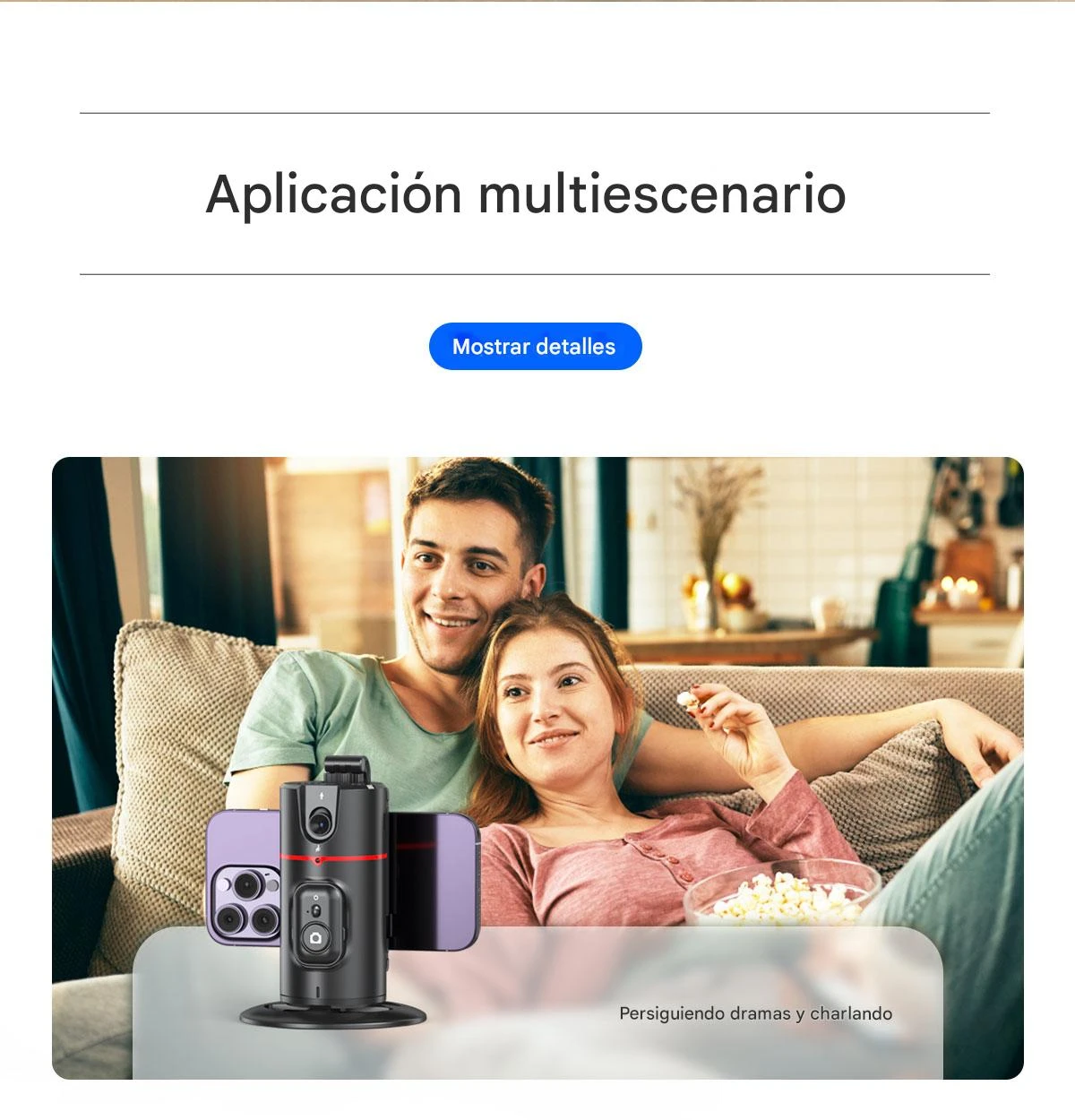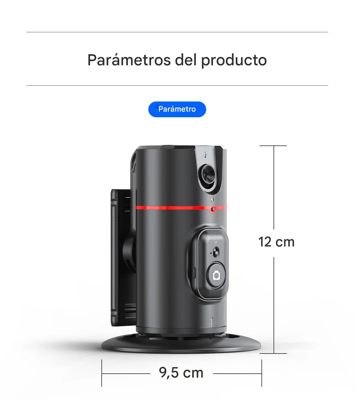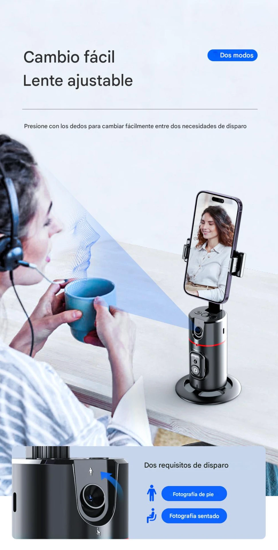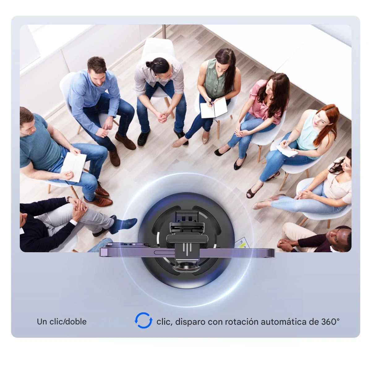 - Rotación 360° y giro de 180°: proporciona libertad total para orientar el teléfono y capturar tomas en diferentes ángulos sin mover el soporte base.