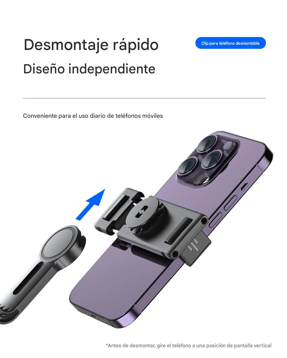 - Diseño modular con anillos y clips para sujetar el teléfono de forma segura en modo horizontal o vertical.