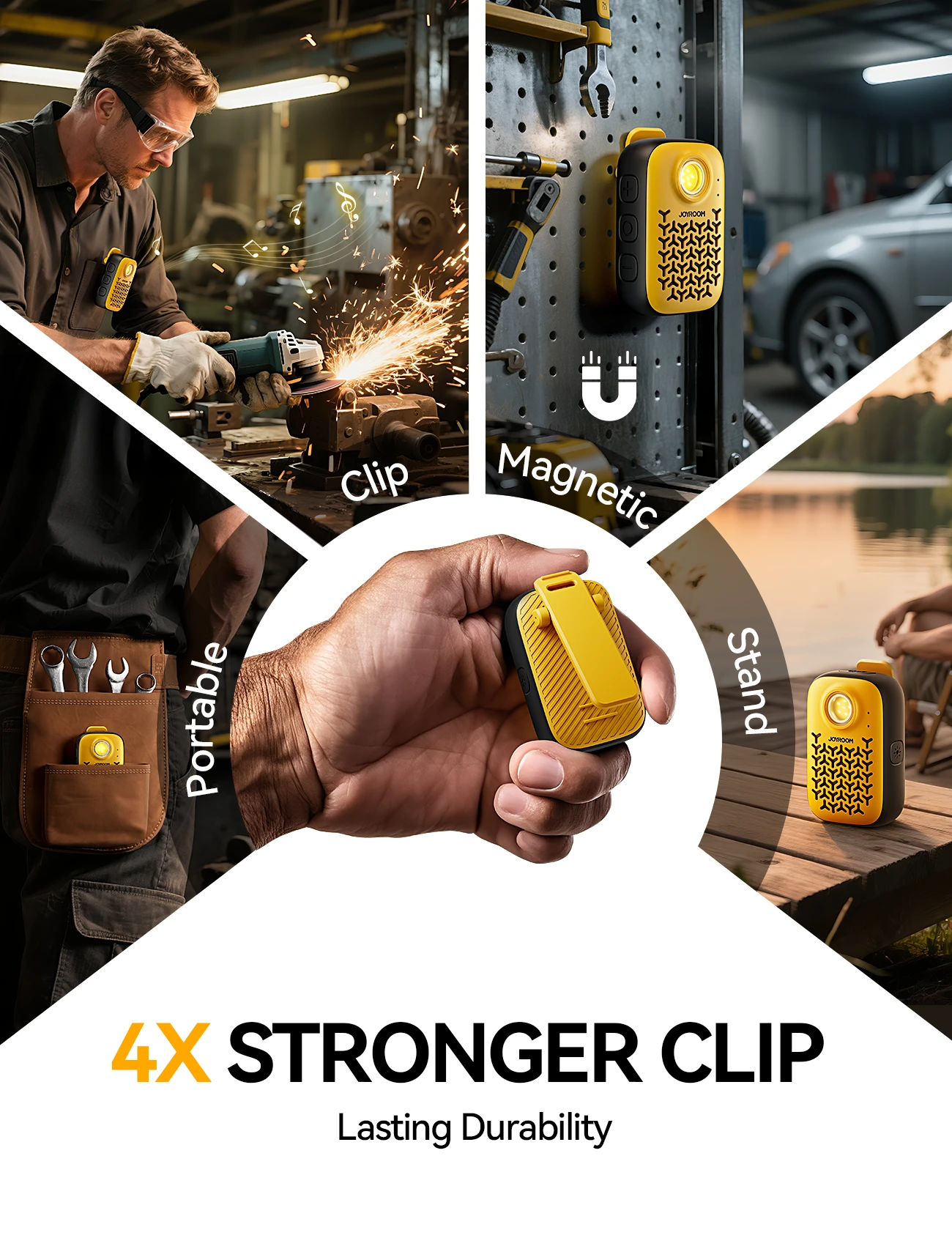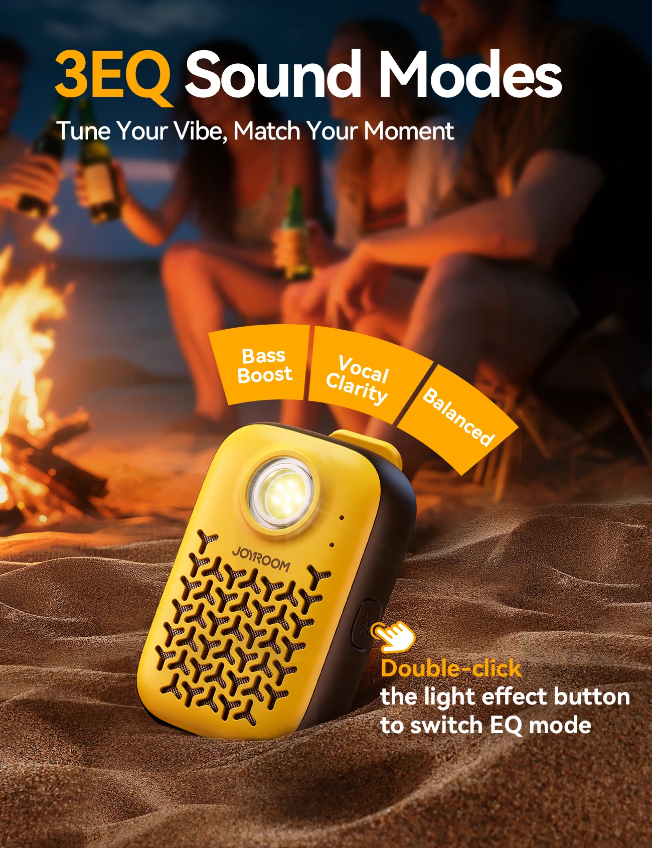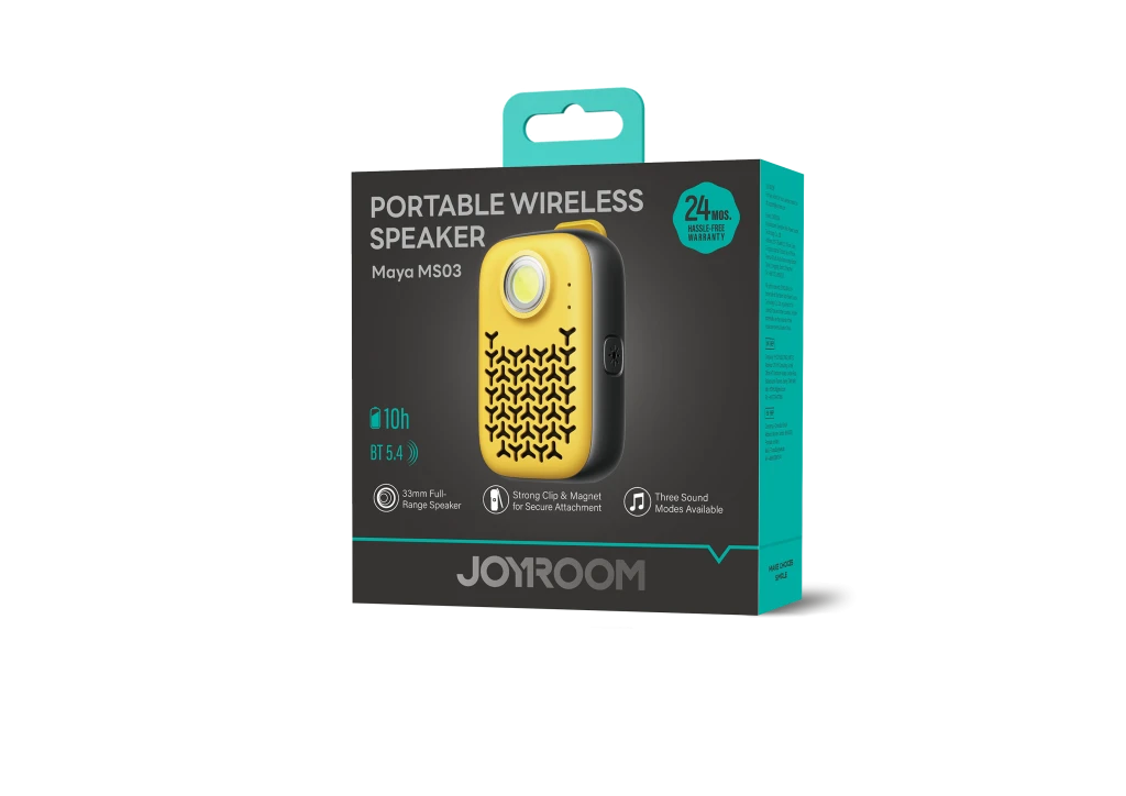 Lleva música, luz y llamadas nítidas a cualquier parte. El ligero Joyroom JR-MS03 pesa tan solo 86 g, pero incorpora un altavoz de rango completo de 33 mm, tres modos de sonido conmutables y una carcasa impermeable IP67 resistente a la lluvia, la arena y la inmersión total. Un clip de alta resistencia y un imán integrado te permiten sujetarlo a mochilas, manillares o equipos de gimnasio, mientras que la luz LED integrada ofrece una cobertura del 50 %, 100 % y un flash SOS para tareas de camping o emergencias en carretera. El Bluetooth 5.4 mantiene una latencia baja y la tecnología ENC filtra el ruido del viento y de las multitudes para que las llamadas se mantengan nítidas incluso en calles concurridas.