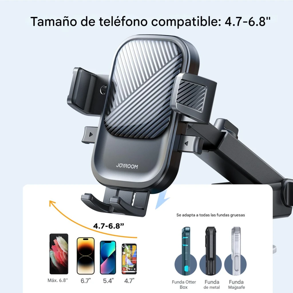 Es un soporte universal para muchos modelos de smartphones. Compatible con teléfonos de 4.7 a 6.8 pulgadas.